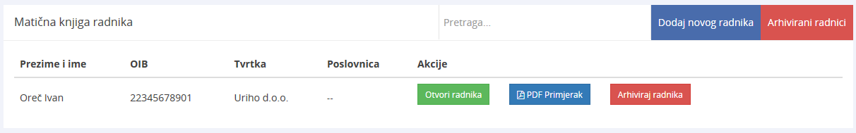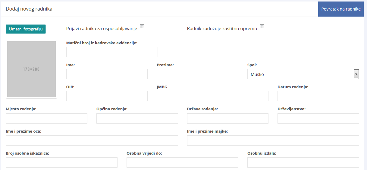 Za upis podataka za novog radnika kliknite na gumb „Dodaj novog radnika“ pri čemu se otvara ekran sa web obrascem za upis podataka. Polja „ime“, „prezime“ i „OIB“ su obavezna a ostala polja su opcionalna, odnosno mogu se i naknadno upisati ako nemamo odmah sve informacije o radniku.
