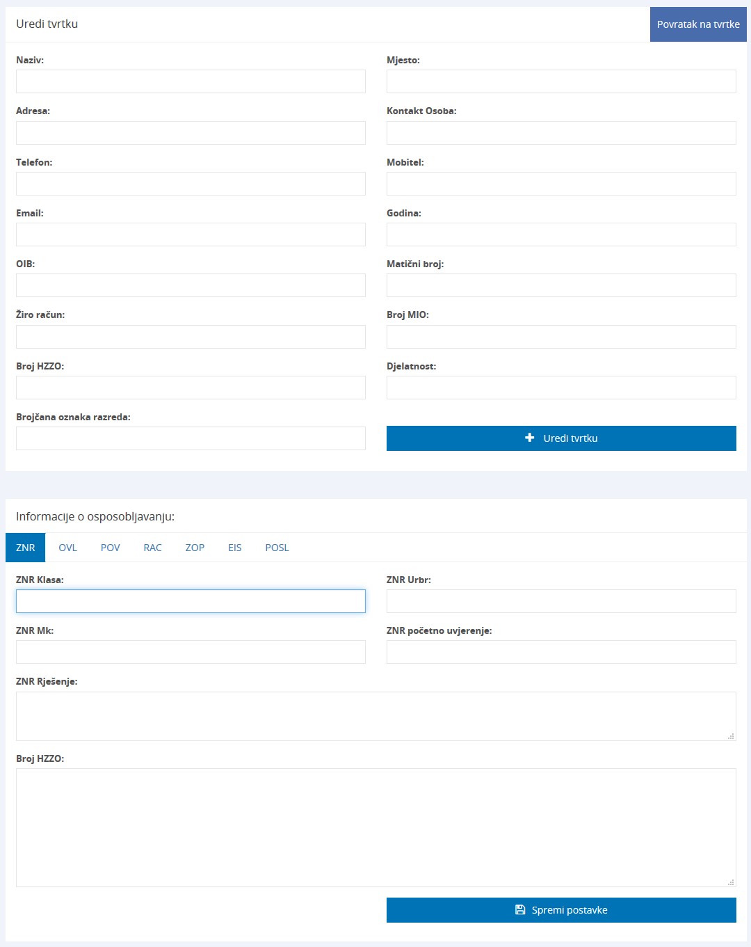 U ovome module unosite sve glavne podatke za tvrtku, podatke za kontakt osobu te informacije o osposobljavanju navedene kontakt osobe.