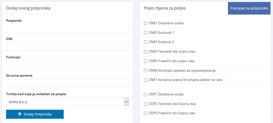 U ovom modulu možete dodati potpisnike tvrtke i definirati popis mjesta za potpis.